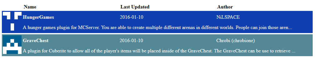RE: My version of a plugin repository - bearbin - 11-29-2015 Is it fixed now? RE: My version of a plugin repository - Seadragon91 - 11-29-2015 Yes, works fine now. RE: My version of a plugin repository - Schwertspize - 12-14-2015 Will you set plugins.cuberite.org that it points to the right location? If not, you can point it to 185.26.156.44 => a mod_rewrite rule will rewrite to the azure website. RE: My version of a plugin repository - sphinxc0re - 12-14-2015 What about hosting the plugin repo on my VPS? The redirection would be much easier this way RE: My version of a plugin repository - NiLSPACE - 01-11-2016 The repo is slowly filling up, but do we like the style of the repo? Personally I'm not really a fan of the tiles. I'd rather have a list of all the plugins with a small description. Something like this: Here is my code: