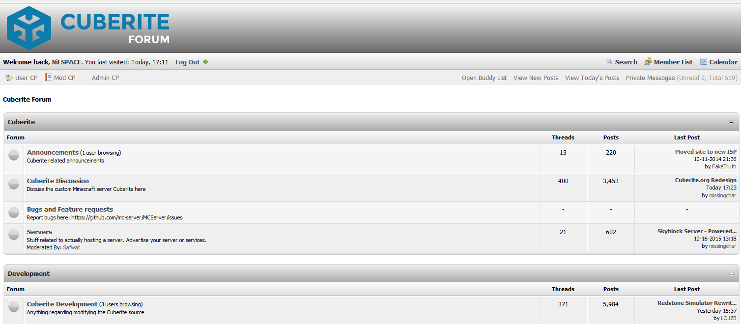 RE: Cuberite Forum redesign - NiLSPACE - 08-21-2015 I got to admit that it looks really nice And it would look great with this if we make it white.Though it uses MyBB 1.8.x while we use 1.6.6 I believe. We'd have to update first, and I'm not sure if the database would be compatible. RE: Cuberite Forum redesign - sphinxc0re - 08-21-2015 White one