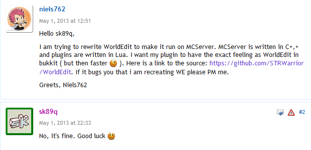 RE: WorldEdit - tonibm19 - 05-03-2013 (05-03-2013, 06:03 AM)STR_Warrior Wrote: yes i want to add it but i don't know howLook at the CuboidPlus code. RE: WorldEdit - NiLSPACE - 05-03-2013 CuboidPlus is not using cBlockArea. This plugin is using that. Because of cBlockArea this plugin supports .schematics and is way faster. RE: WorldEdit - xoft - 05-03-2013 I'd only do Undo / Redo for the big operations, not for individual block changes. There's not that many of those. Also, I'd keep a "map" of PlayerName -> List of up to N BlockAreas of Undo; N being configurable in the settings. I don't think there'll be many players with WE rights, so this shouldn't grow too large. Also, one must not forget to clear the list for a player when that player disconnects (or maybe after a timeout; if they reconnect soon, keep their undo). RE: WorldEdit - NiLSPACE - 05-03-2013 Fun fact: This plugin can crash your minecraft client if you use a region that is too large. RE: WorldEdit - tonibm19 - 05-03-2013 I have a pluggin suggestion for you. Could you make a WorldGuard type plugin? It would be very usefull. RE: WorldEdit - NiLSPACE - 05-03-2013 I have no idea how to do that :S RE: WorldEdit - xoft - 05-03-2013 Crash, or freeze? I know that writing a big BlockArea will freeze the client for a while, but never seens a crash. |
