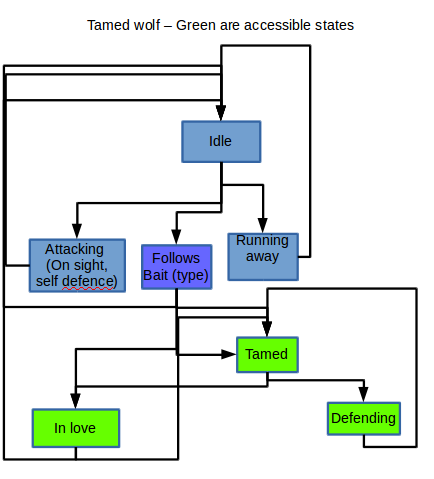 With this architecture, each mobtype is defined solely by its enabled state combination and their parameters. (And possibly few exceptions like overriding some transitions between states (e.g. wolf idle > attacking requires sending the angrywolf packet).