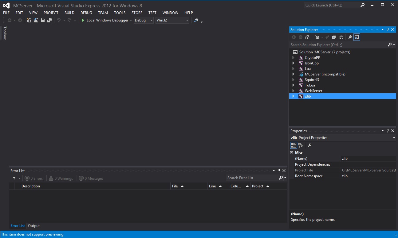 also the 2012 version says that the MCServer project inside the soltion is incompatible: